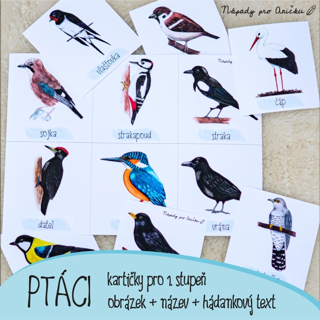 S kartičkami můžeme pracovat jednotlivě nebo ve skupině, staticky nebo s pohybem (rozmístíme je po prostoru na jednu stranu dáme obrázky, na druhou názvy/charakteristiky, děti běhají a obrázky párují apod.). Ptáky také můžeme rozdělovat podle různých kritérií – velikosti, biotopu, typu potravy, zda odlétají v zimě na jih, zda je můžeme pozorovat na krmítku apod. Obrázky můžete také vystřihnout a využít je kreativně (vytvořit koláž, pověsit na provázek, přilepit na větvičku, nalepit do okna apod). Na plakátu ptáků jsou zohledněny velikosti jednotlivých druhů.