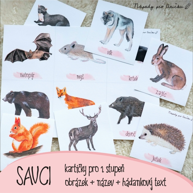 S kartičkami můžeme pracovat jednotlivě nebo ve skupině, staticky nebo s pohybem (rozmístíme je po prostoru na jednu stranu dáme obrázky, na druhou názvy/charakteristiky, děti běhají a obrázky párují apod.). Savce můžete také vystříhnout a využít je kreativně (vytvořit koláž, pověsit na provázek, vytvořit loutku, nalepit do okna apod).