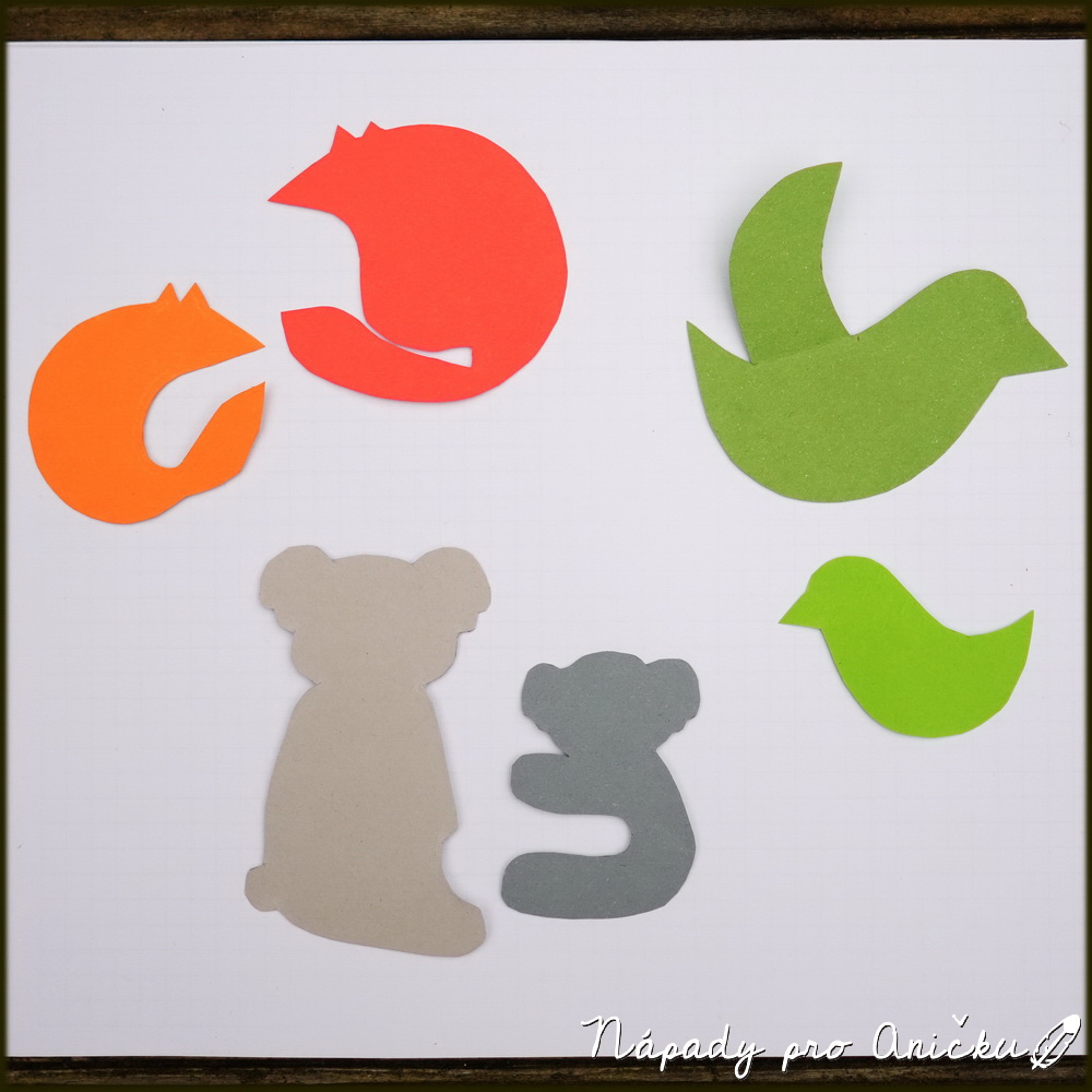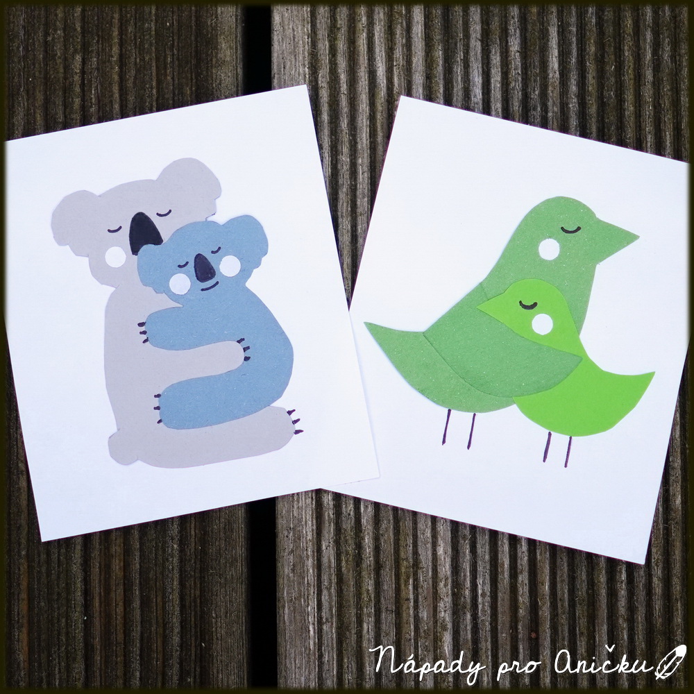Jsou to vždy dvě zvířátka, která se do sebe zaklesnou, a tak vypadají, že se objímají či tulí. Každé zvířátko z dvojice je vhodné vystřihnout z jiné barvy/odstínu papíru. Nejlepší je začít tím, že si předkreslíme na bílý papír, jak by měl vypadat výsledný obrázek, pak ho rozstřihneme napůl. Poté výsledek obkreslíme na barevné papíry. Zvířátka, která jsou v dolní vrstvě, jsem méně "vykrajovala", aby se na ně mohlo menší zvířátko přilepit. Ale není to nutné, pokud celý obrázek nalepíme na podkladový papír či přáníčko. Dokreslíme fixou. Na tváře jsem použila kolečka z děrovačky.