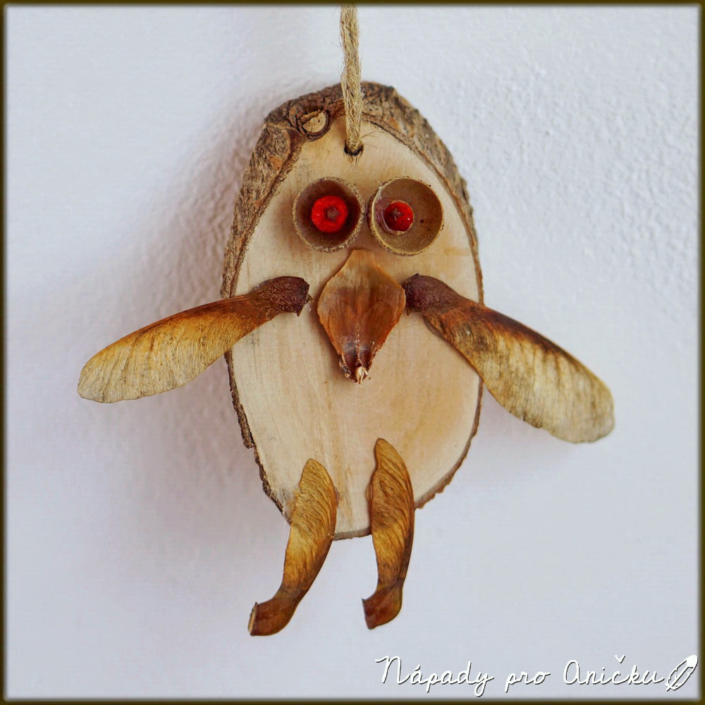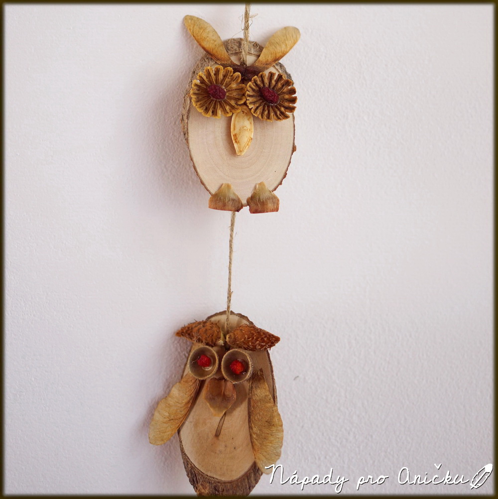 Jednoduché a naučné tvoření nejen na podzimní dny. Na základ potřebujeme dřevěná kolečka (oválky) - případně kolečka z hnědé lepenky. Na procházce venku nasbíráme různé přírodniny: bukvice, vrtulky z javoru, čepičky z žaludů, šišky, různá semínka, bobulky či makovice. U každé nové věci si nezapomeneme říci, jak se jmenuje a z jakého stromu (rostliny) pochází. Pak z nasbíraných věcí skládáme na kolečka různé příšerky nebo sovičky. Lepily jsme tavnou pistolí - menším dětem raději pomozte.