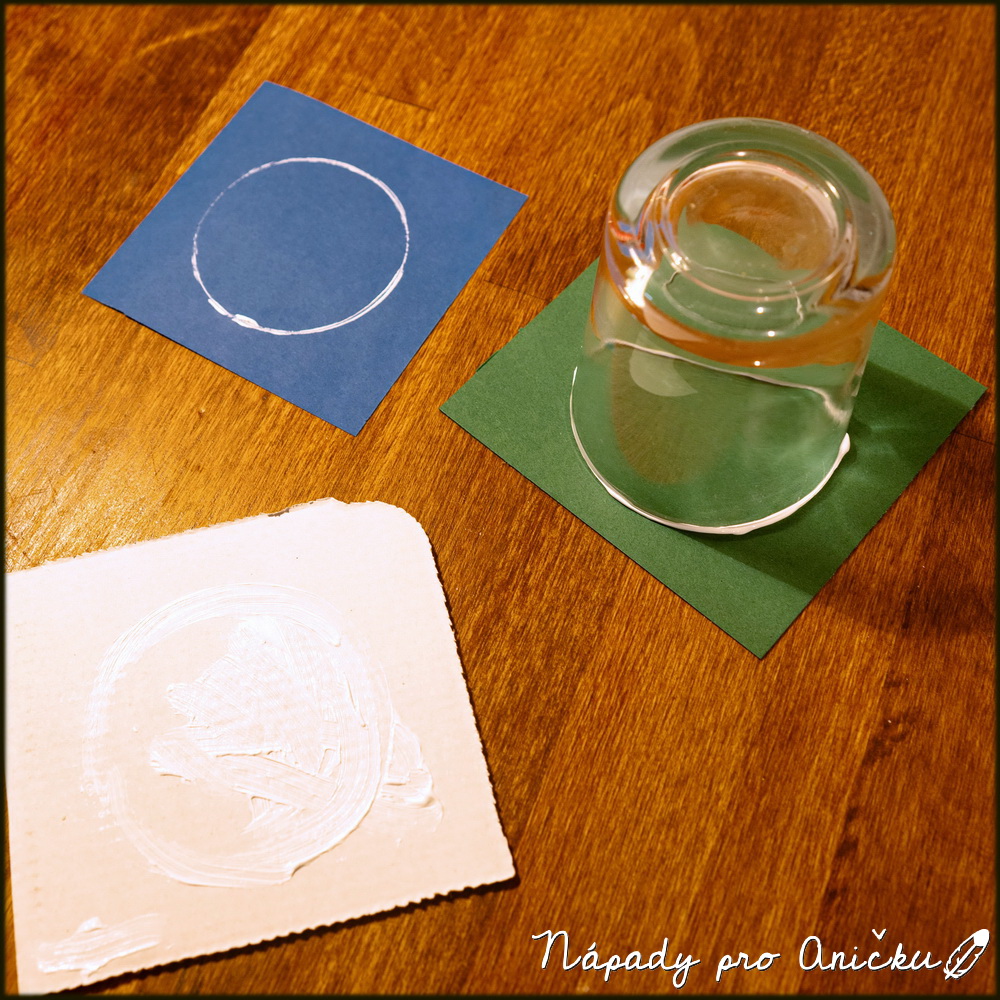 Temperu rezetřeme na podložku tak, abychom v mí mohli namočit vršek skleničky. Nabarvenou skleničku obtiskneme na papír. Pokud se nám to nepovede, lze to zopakovat. Až tempera uschne, domalujeme kolem kruhu lístečky a bobulky.